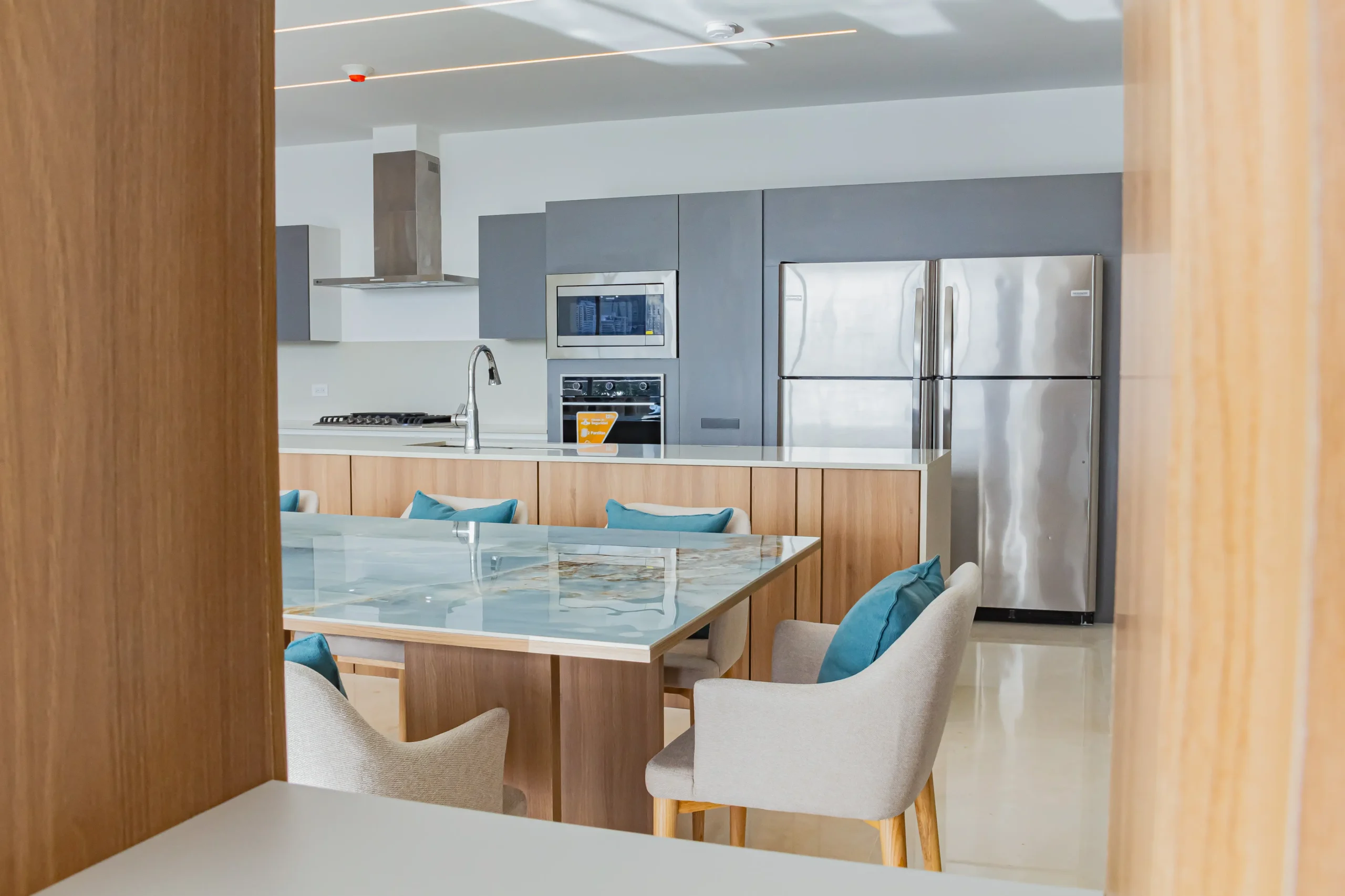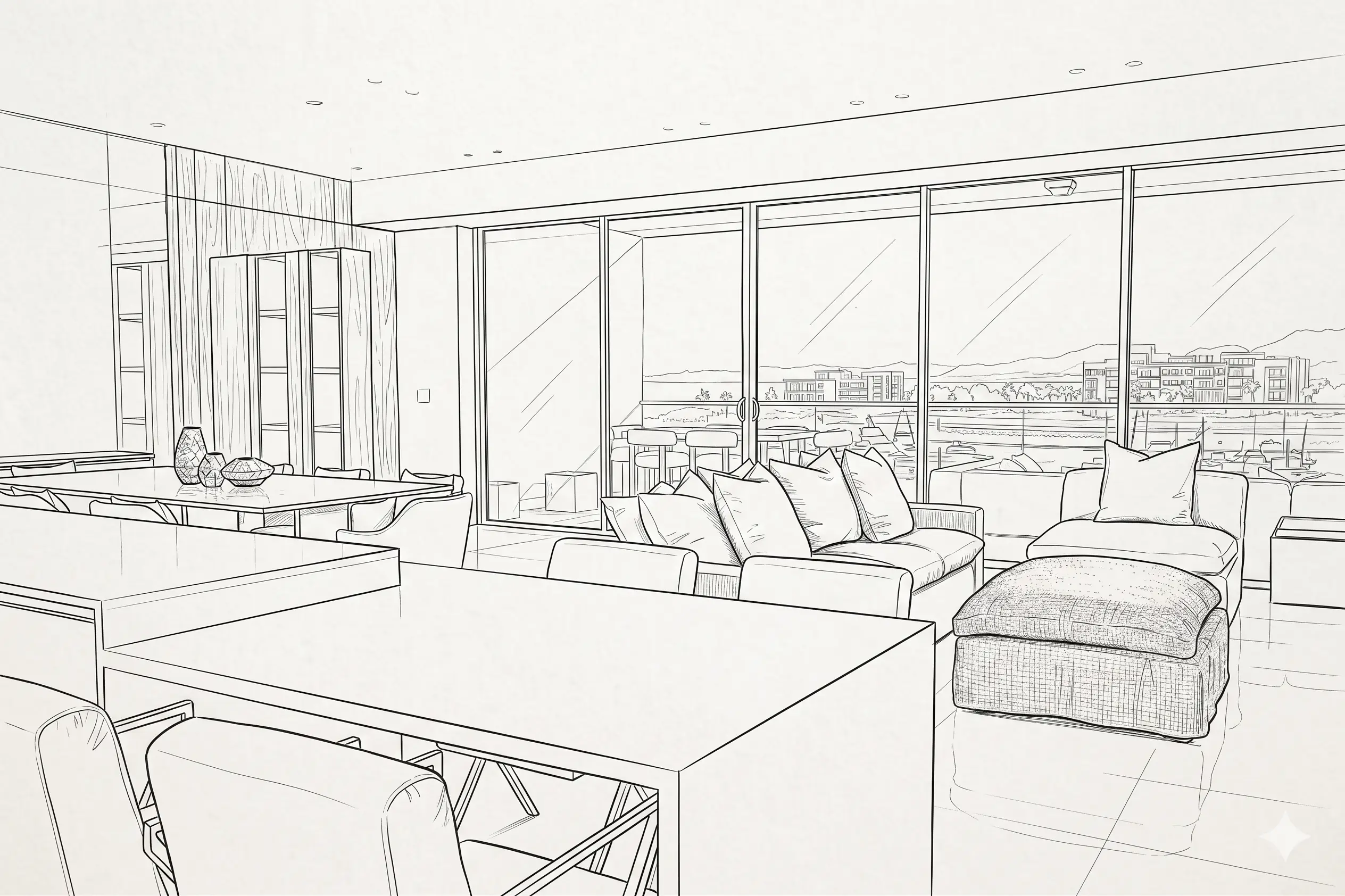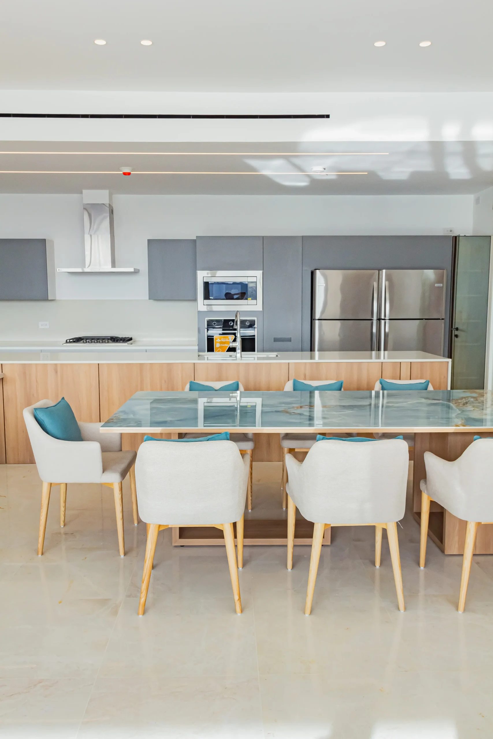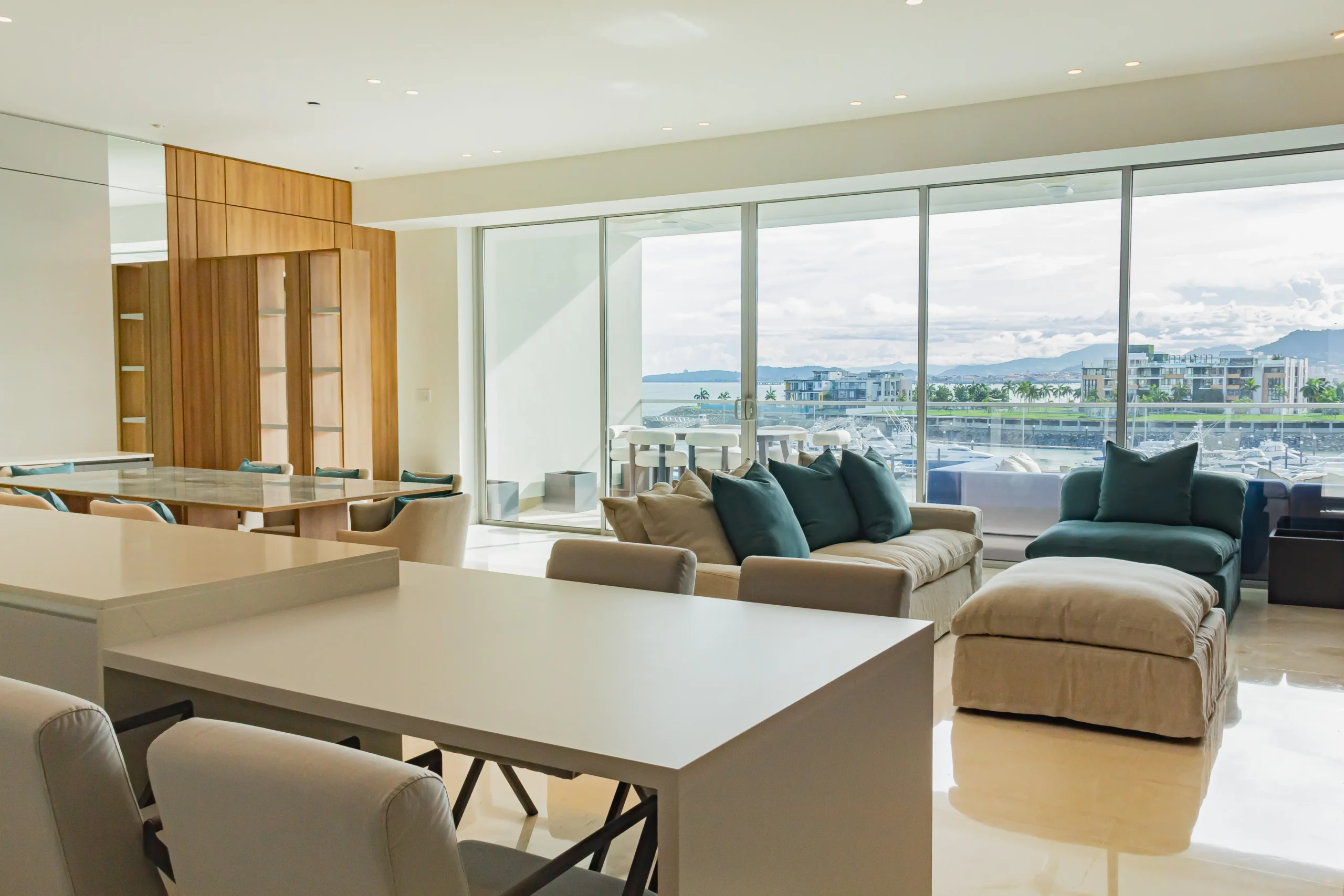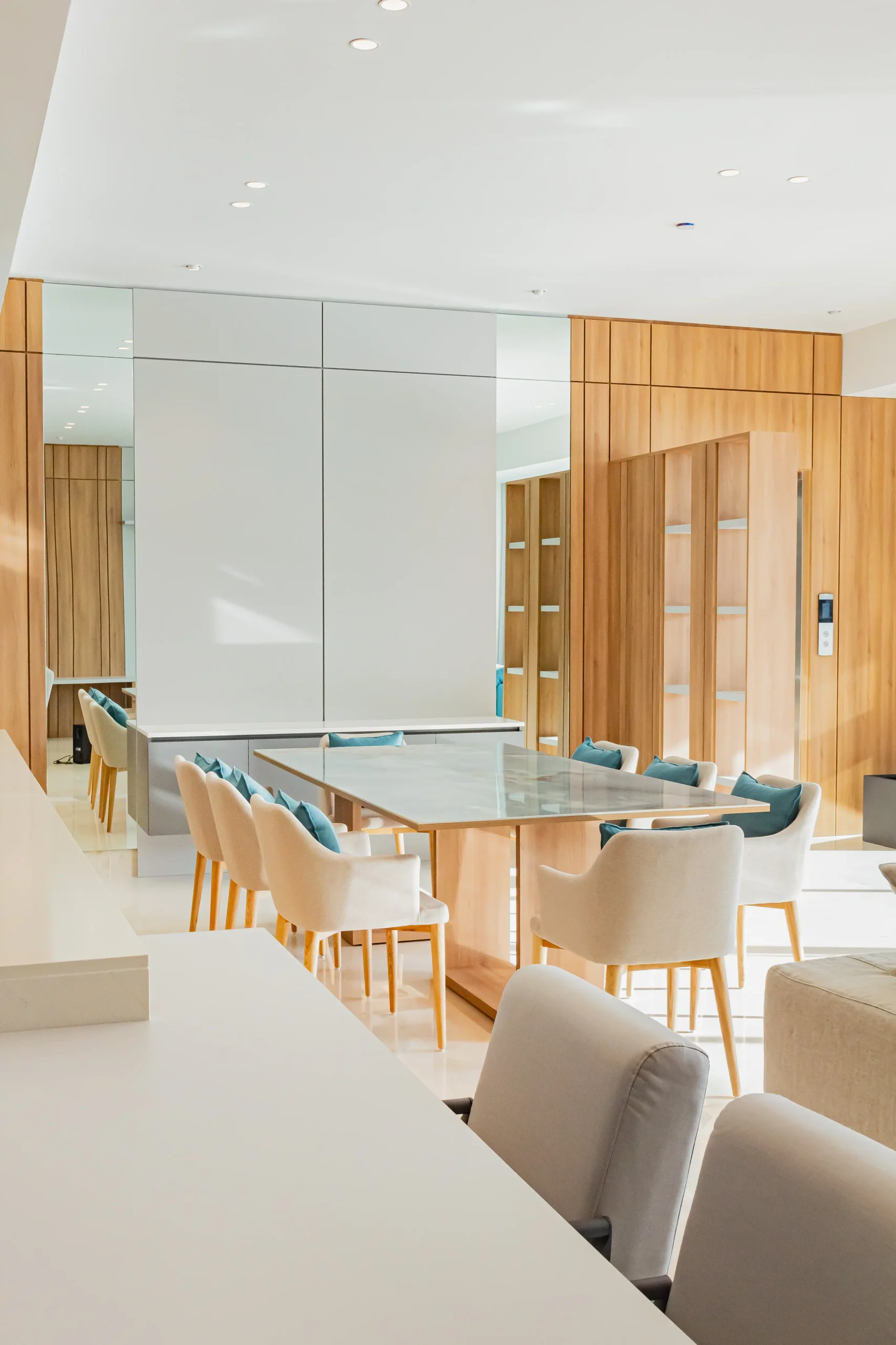 The social areas unfold in a seamless open plan, where clean architectural lines and a restrained material palette establish a sense of calm continuity.