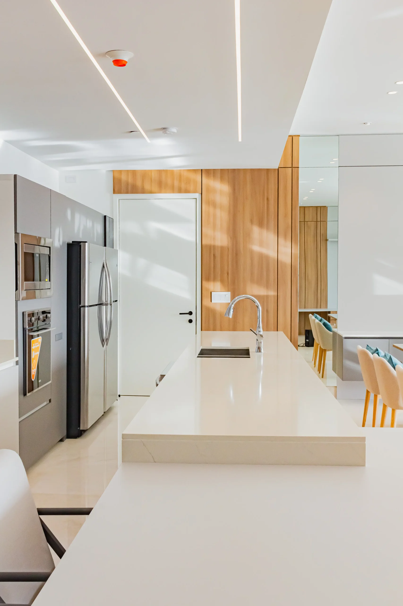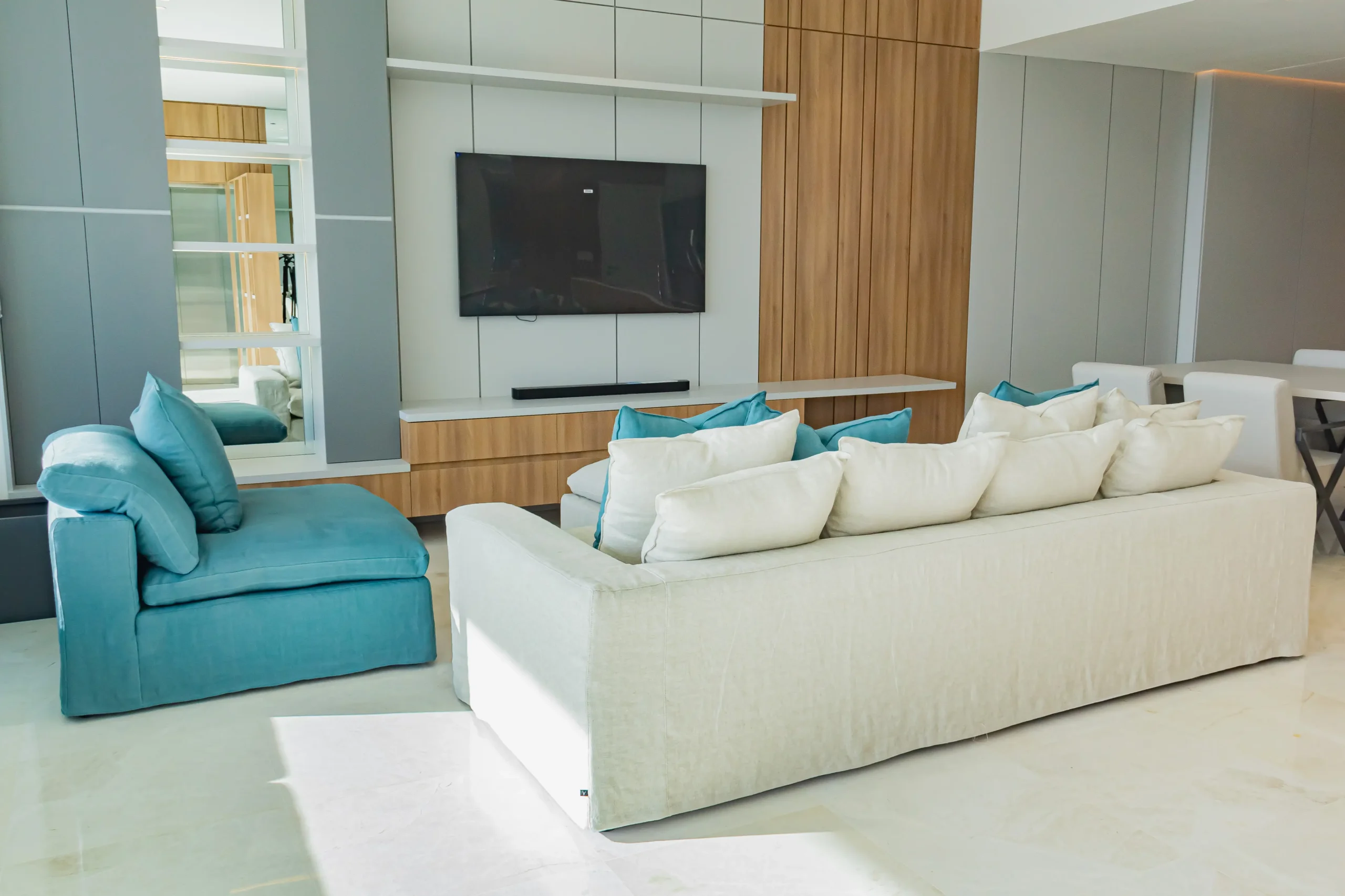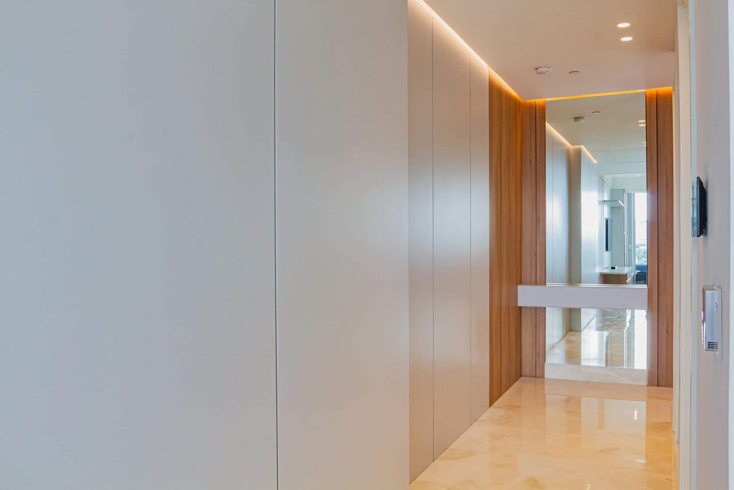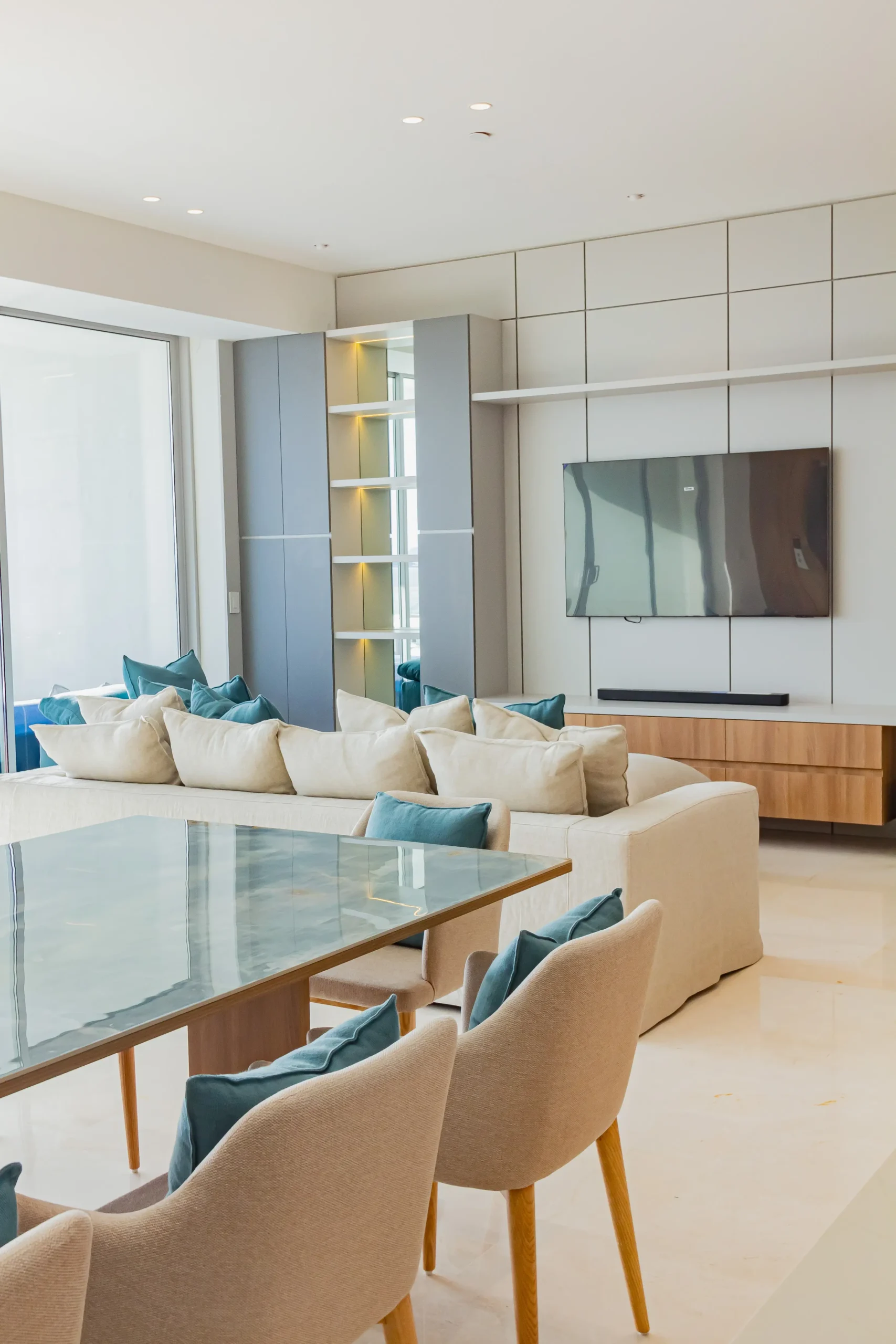 Where clean architectural lines and a restrained material palette establish a sense of calm continuity. Custom paneling and integrated millwork define the spaces with precision, while layered lighting enhances both functionality and ambiance. Floor to ceiling openings dissolve the boundary between interior and exterior, allowing natural light and ocean views to become an intrinsic part of the living experience. Throughout, bespoke TV units and concealed storage solutions reinforce a language of clarity and order.