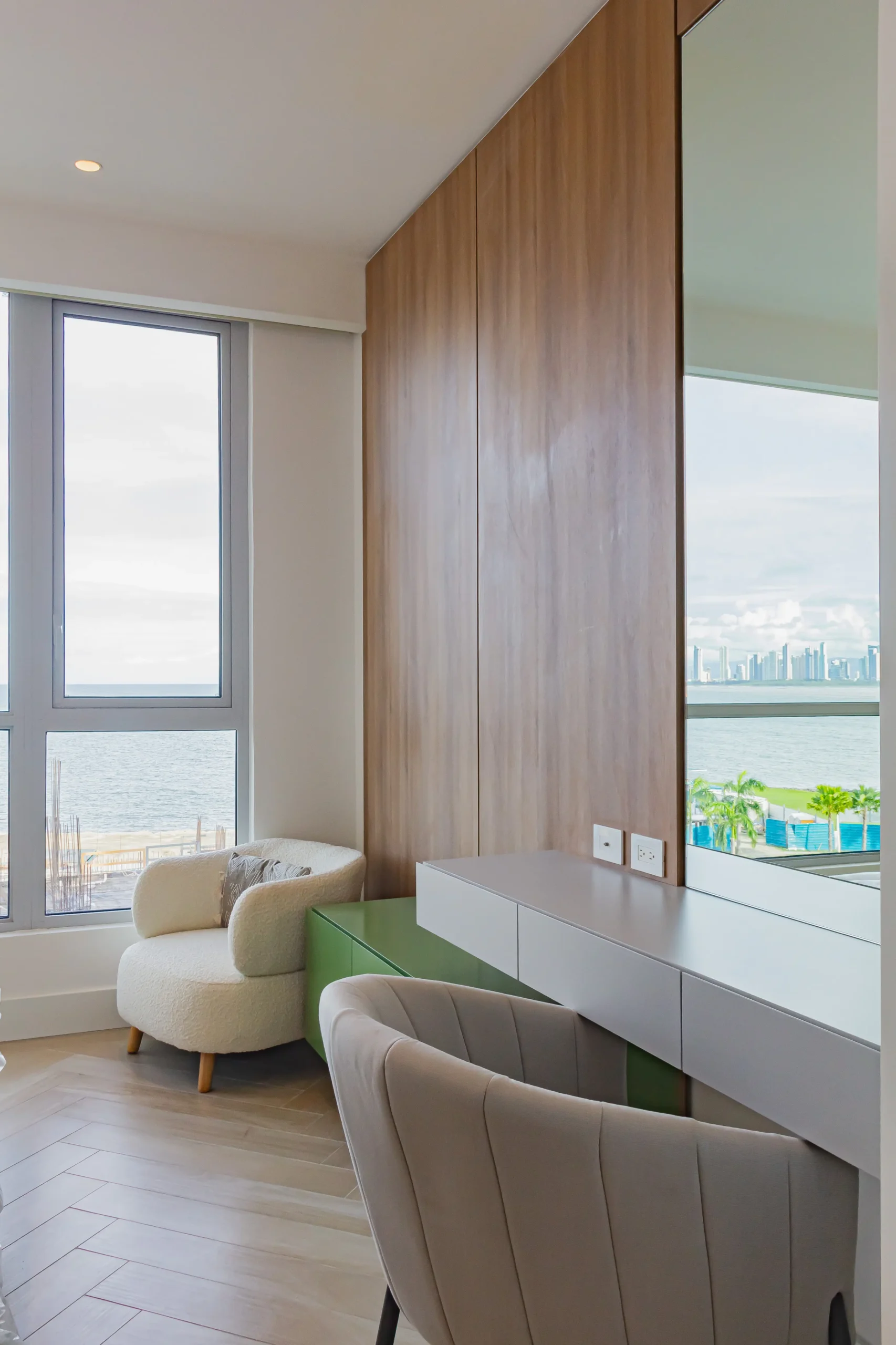 Custom paneling and integrated millwork define the spaces with precision, while layered lighting enhances both functionality and ambiance. Floor to ceiling openings dissolve the boundary between interior and exterior, allowing natural light and ocean views to become an intrinsic part of the living experience. Throughout, bespoke TV units and concealed storage solutions reinforce a language of clarity and order.